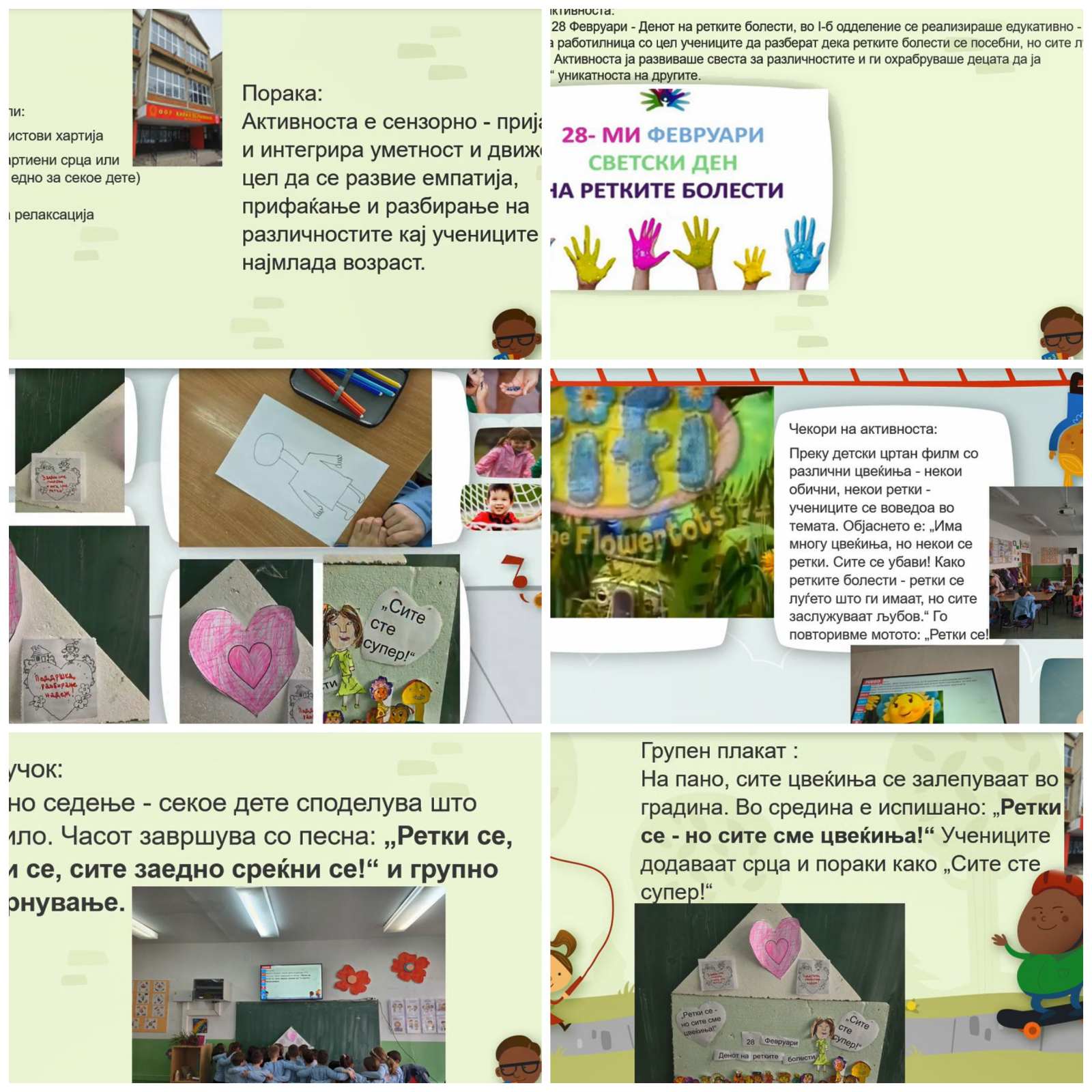 Преку детски цртан филм со различни цвеќиња - некои обични, некои ретки - учениците се воведоа во темата. Објаснето е: „Има многу цвеќиња, но некои се ретки. Сите се убави! Како ретките болести - ретки се луѓето што ги имаат, но сите заслужуваат љубов.“ Го повторивме мотото: „Ретки се!“